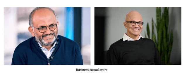 Satya Nadella and Shantanu Narayen, as CEOs of major tech giants are recognized for their business savvy, consistent sartorial choices. Often seen in well-fitted, dark-colored suits, Nadella prefers slim-cut styles paired with open-collar shirts, avoiding traditional ties. Shantanu Narayen, the CEO of Adobe, favors a classic and refined attire. He typically wears traditional suits in blue, gray, or brown, paired with light-colored shirts and conservative ties. His timeless style, along with his clean-shaven head, reflects Adobe’s reputation for creativity and reliability. Nadella’s modern, streamlined look and Narayen’s classic, refined appearance not only define their personal brands but also embody the innovative and steadfast cultures of Microsoft and Adobe.